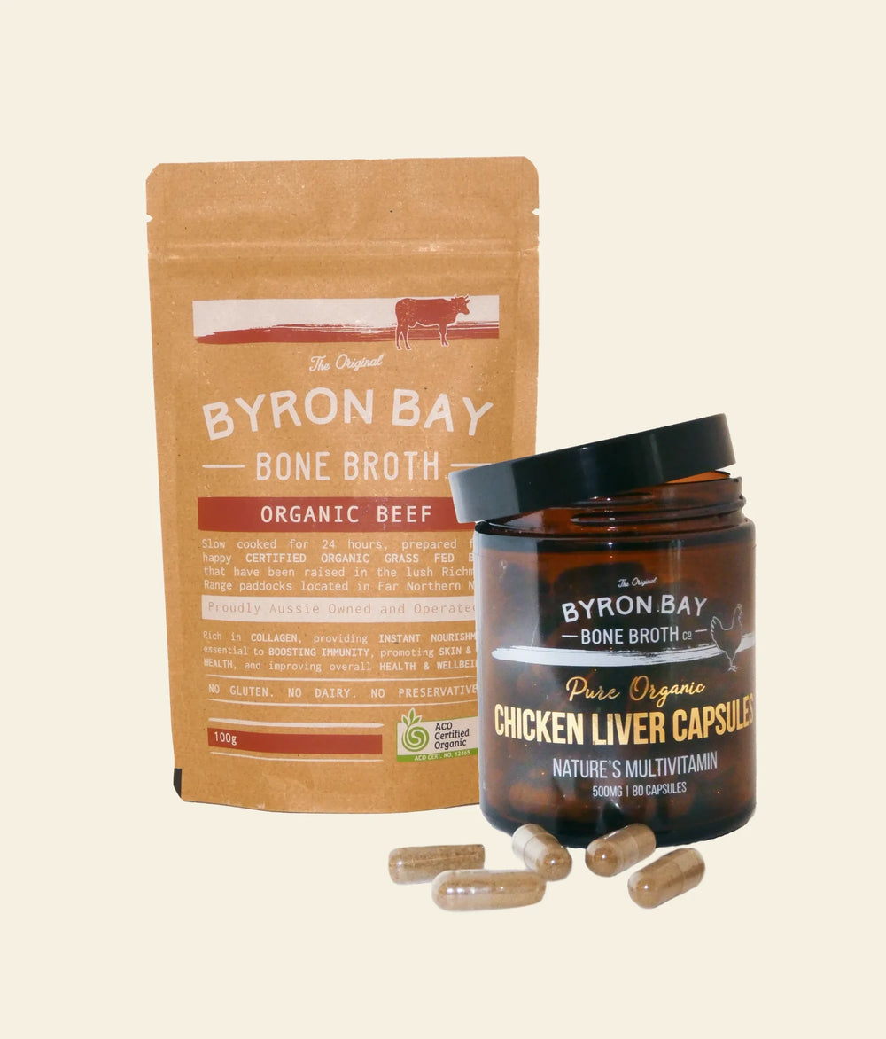 Level up your daily wellness with this powerhouse pairing: our best-selling Organic Chicken Liver Capsules and Organic Beef Bone Broth Powder — bundled for energy, immunity, and whole-body support.